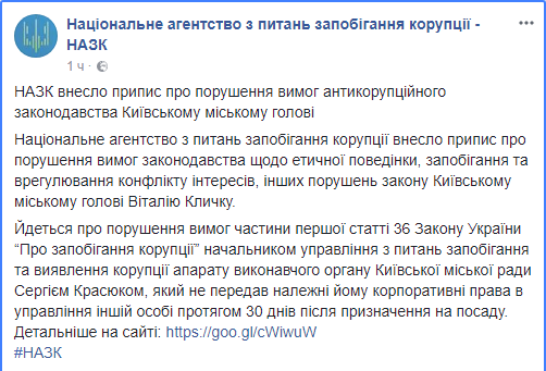 НАПК внесло предписание о нарушении антикоррупционного законодательства мэру Киева Виталию Кличко, против которого расследуют дело из-за чартерных полетов с нардепом Микитасем. Об этом сообщает пресс-служба НАПК в Facebook.