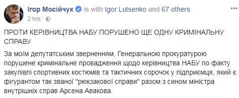 "По моему депутатскому обращению Генеральной прокуратурой возбуждено уголовное производство против руководства НАБУ по факту закупки спортивных костюмов и тактических рубашек у предпринимателя, который является фигурантом так называемого "рюкзачного дела" вместе с сыном министра внутренних дел Арсена Авакова", - написал депутат.