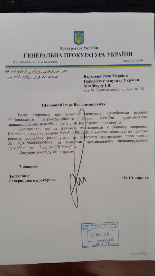 Генеральная прокуратура возбудила против руководства Национального антикоррупционного бюро новое уголовное производство. Об этом сообщил народный депутат от Радикальной партии Игорь Мосийчук на странице в Facebook.