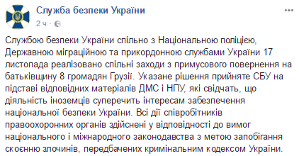 "Службой безопасности Украины совместно с Национальной полицией, Государственной миграционной и пограничной службами Украины 17 ноября реализованы совместные мероприятия по принудительному возвращению на родину 8 граждан Грузии", - сказано в нем.