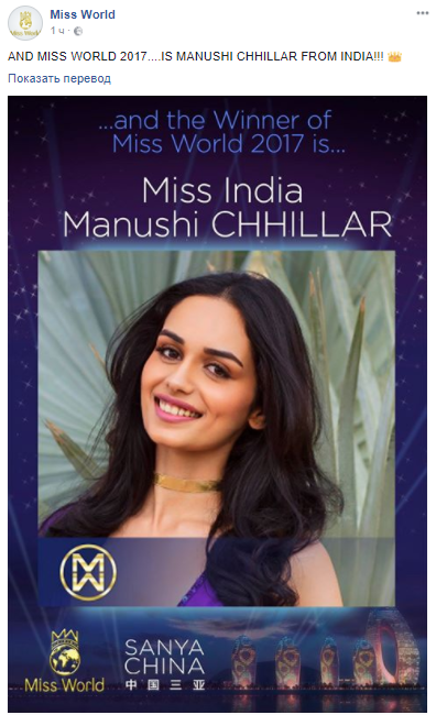 Жительница Индии Мануши Чхиллар стала обладательницей титула "Мисс Мира - 2017". Об этом сообщает пресс-служба конкурса в Facebook.