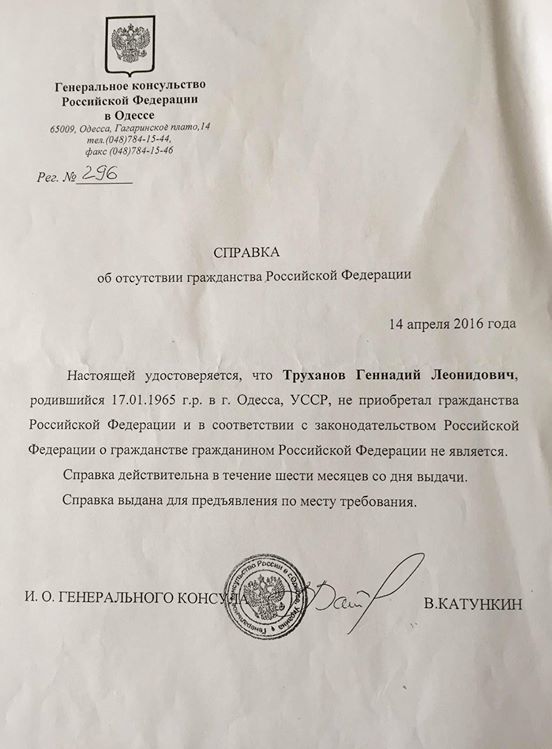 Но противники мэра продолжали публиковать в интернете копии неких выписок, которые, по мнению авторов, свидетельствуют о наличии у градоначальника паспорта страны-агрессора. На это одесский мэр опубликовал справку из российского консульства, в которой говорится, что гражданства РФ он не имеет.