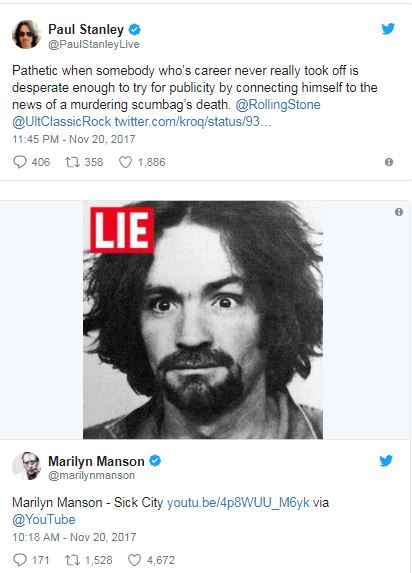 Пол Стэнли, участник группы Kiss Пол назвал музыканта Мэрилина Мэнсона "жалким" из-за реакции на смерть лидера коммуны убийц "Семья" Чарльза Мэнсона, сообщает NME.