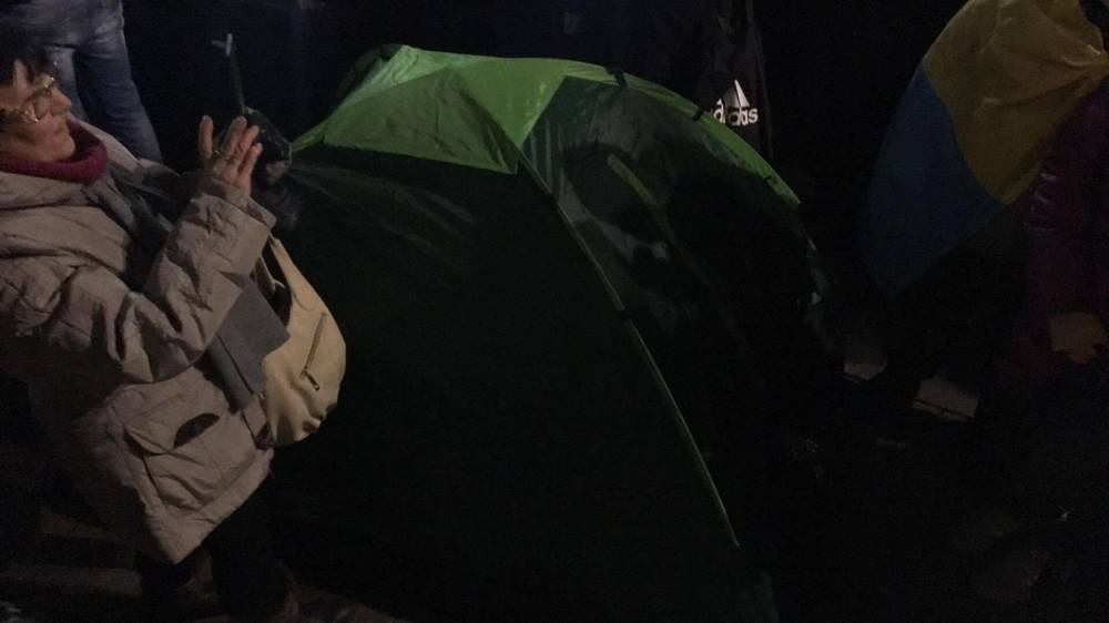 Между тем лидер активистов Сергей Мельниченко утверждает, что установка палаток санкционирована и просит полицейских уйти от сцены.