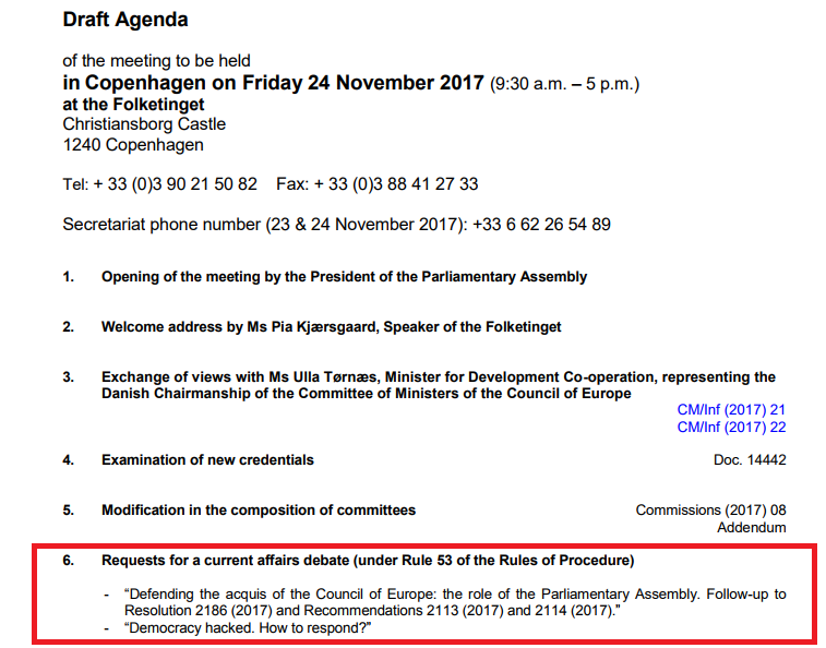 Комитет встретится 24 ноября этого года в Копенгагене. Предложенный пункт указан весьма необычно: "Защита нормативной базы Совета Европы: роль ПАСЕ - в продолжении резолюции 2186 (2017) и рекомендаций 2113 (2017) и 2114 (2017)".