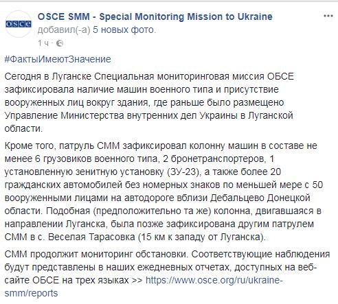 "Сегодня в Луганске Специальная мониторинговая миссия ОБСЕ зафиксировала наличие машин военного типа и присутствие вооруженных лиц вокруг здания, где раньше было размещено Управление Министерства внутренних дел Украины в Луганской области", - сообщает пресс-служба.