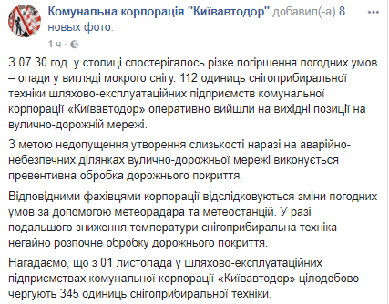 "С 07:30 в столице наблюдалось резкое ухудшение погодных условий - осадки в виде мокрого снега. 112 единиц снегоуборочной техники дорожно-эксплуатационных предприятий коммунальной корпорации "Киевавтодор" оперативно вышли на исходные позиции на улично-дорожной сети", - говорится в сообщении.