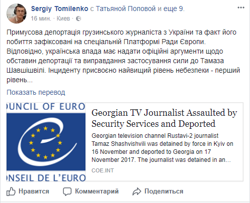 "15 вооруженных людей, принадлежащих к украинским спецслужбам, штурмовали его квартиру, ударили его по лицу пистолетом и завязали глаза. 17 ноября Шашвишвили был депортирован в Грузию ... вместе с группой граждан Грузии, обвиняемых в деятельности, противоречащей интересам национальной безопасности Украины", - сообщают в Совете Европы.