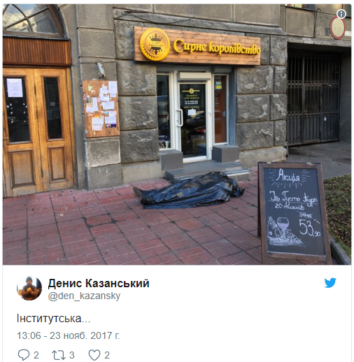 В центре Киеве на Институтской сегодня днем, 23 ноября, умер человек. Об этом в Twitter журналист Денис Казанский.
