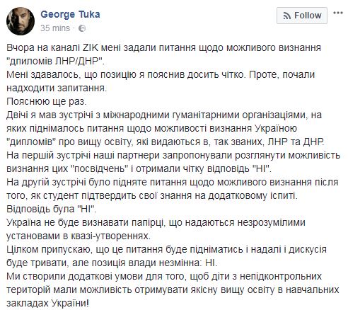 Украина не будет признавать дипломы, выданные на территории так называемых "ЛДНР". Об этом написал замминистра по вопросам АТО Георгий Тука на своей странице в Facebook.