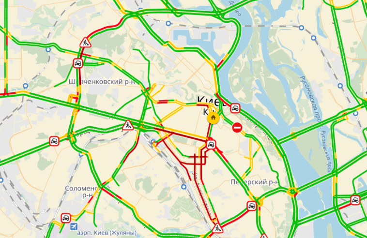 Ситуация с движением в столице Украины осложнена дорожными работами и ДТП, а также Черной пятницей, что особенно сказывается на дорожном движении у торговых центров.