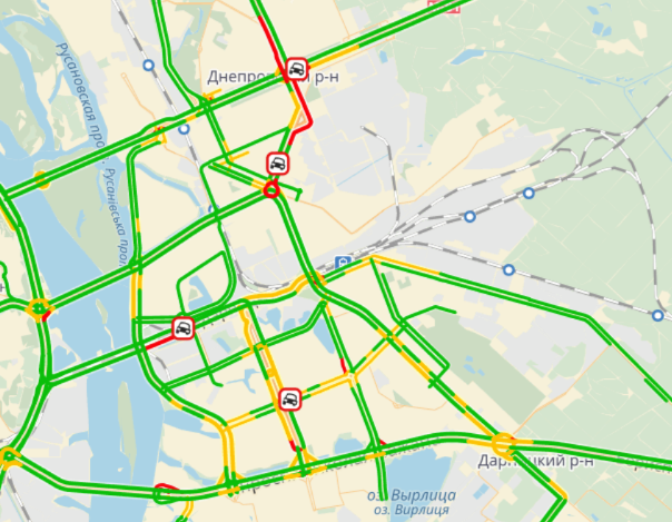На Левобережье пробки в районе станции метро Черниговская и вокруг Дарницкой площади.