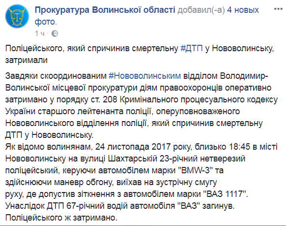 Правоохранители города Нововолынска Волынской области задержали 23-летнего полицейского, спровоцировавшего пьяное смертельное ДТП.