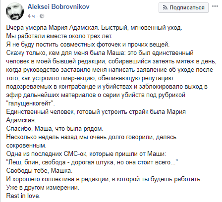 "Единственный человек, готовый устроить страйк была Мария Адамская. Спасибо, Маша, что была рядом. Несколько недель назад мы очень долго говорили, делясь сокровенным. Одна из последних СМС-ок, которые пришли от Маши: