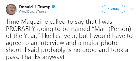 Дональд Трамп заявил, что ему позвонили из журнала Time и сообщили, что он, возможно, получит звание человека года второй год подряд. Об этом президент США написал в Twitter.
