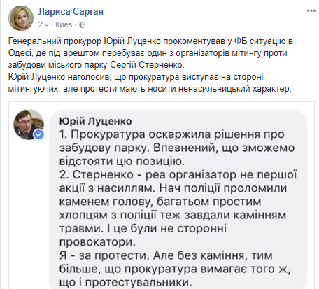 Она сослалась на комментарий Луценко в соцсети. Он отметил, что прокуратура обжаловала решение о застройке парка.