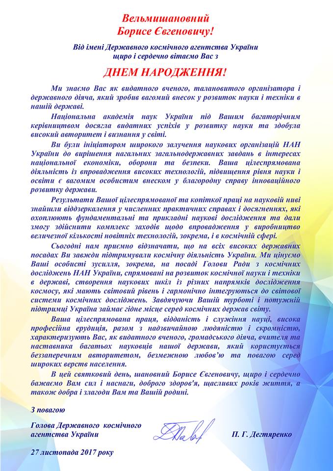 Сегодня, 27 ноября, украинский ученый, известный изобретатель и президент Национальной академии наук Борис Патон отмечает 99-летие. С днем рождения его поздравляют сотрудники  Государственного космического агенства Украины на странице в Facebook.
