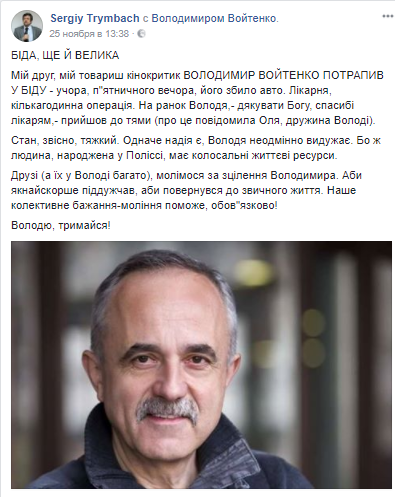 "Мой друг кинокритик Владимир Войтенко попал в беду - его сбила машина. Больница, несколькочасовая операция. Володя, - слава Богу, спасибо врачам, - пришел в себя. Состояние стабильно тяжелое, но надежда есть", - сообщил Трымбач.