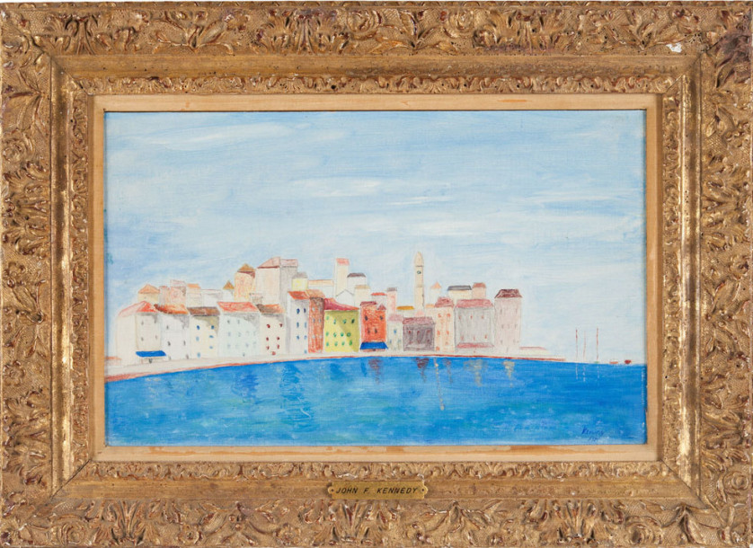 Стоимость полотна с автографом Кеннеди, на котором изображены дома, стоящие у воды, на данный момент составляет $42 тыс. — ставки на нее повышались уже дважды.