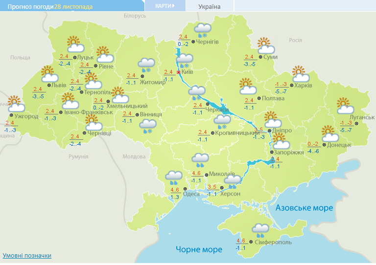 В понедельник, 28 ноября, в Украине в центральной Украине гололед и налипание мокрого снега; на юге - сильный ветер; на востоке днем - мороз. Об этом говорит прогноз Укргидрометцентра.