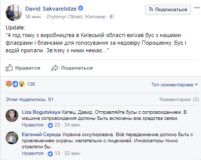 Экс-замгенпрокурора Давид Сакварелидзе сообщил о пропаже водителя и микроавтобуса в Киевской области, который выехал около 4 часов назад с флаерами и бланками для голосования за недоверие президенту Порошенко. Об этом соратник Саакашвили сообщил на своей странице в Facebook.