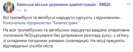 "Все троллейбусные и автобусные маршруты курсируют с отклонением - Коммунальное предприятие "Киевпастранс" На всех троллейбусных и автобусных маршрутах введено оперативное положение №3 (курсирования без соблюдения расписания движения), в связи со сложными погодными условиями (гололедица). На месте работают ответственные службы города", - говорится в сообщении.