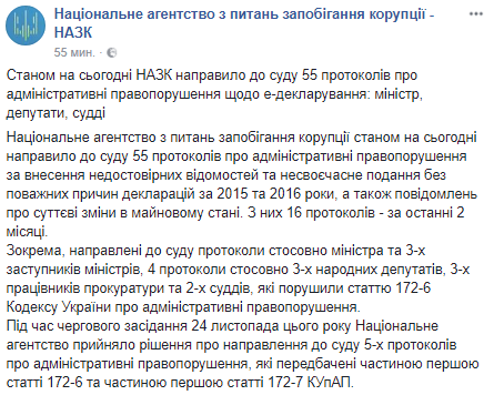 В частности, направлены в суд протоколы в отношении министра и трех заместителей министров, 4 протокола о трех народных депутатов, трех работниках прокуратуры и двух судей, которые нарушили статью 172-6 Кодекса Украины об административных правонарушениях.