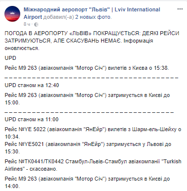 Аэропорт "Львов" также не принимал самолеты, рейсы задерживались. Об этом сообщается на странице аэропорта в Facebook. Рейсы из/в МА "Львов" им. Даниила Галицкого".