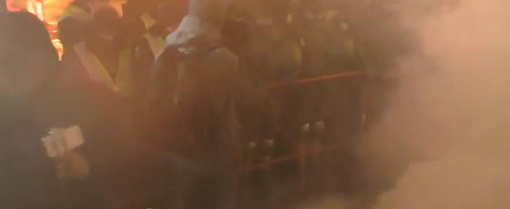 19:16 Активисты бросили к ногам полиции дымовые шашки. Дышать нечем, признаются сами активисты. Каково же полиции, которая даже не может выйти из эпицентра дыма. Пришлось надеть каски.