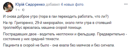 "На пр. Григоренко, 29-й микрорайон, около пяти утра в стоявший троллейбус врезалась машина скорой помощи.