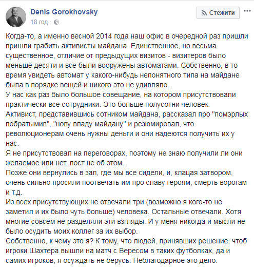 Собственно, к чему это я? К тому, что людей, принявших решение, чтоб игроки "Шахтера" вышли на матч с "Вересом" в таких футболках, да и самих игроков, я осуждать не берусь. Неблагодарное это дело", - написал Денис Гороховский.