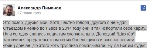 "Это позор, друзья мои. Хотя, честно говоря, другого я не ждал. Отъездом именно во Львов в 2014 году они и так испортили себе карму. Ну а сегодня слились нацистам окончательно. Донецкий "Шахтёр" закончился предательством своих болельщиков и восславлением убийц дончан. До этого хоть трусливо помалкивали. Ну да Бог им судья", - написал Пименов.