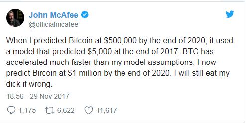 "Когда я предрекал, что биткоин будет стоить 500 тысяч долларов к концу 2020 года, то исходил из того, что к концу 2017-го его курс достигнет пяти тысяч долларов. Между тем биткоин рос гораздо быстрее, и теперь я полагаю, что биткоин будет стоить миллион долларов. И я по-прежнему готов съесть свой член, если ошибусь", — написал Макафи в Twitter.