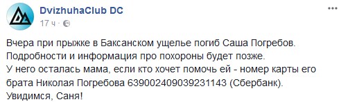 "При прыжке в Баксанском ущелье погиб Саша Погребов. Подробности и информация о похоронах будет позже", – говорится в сообщении.