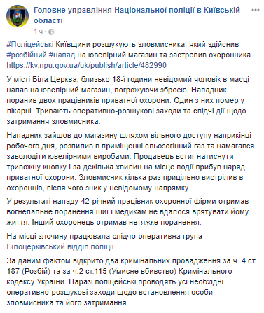В Белой церкви Киевской области грабитель застрелил охранника ювелирного магазина при нападении. Об этом сообщает Нацполиция Киевской области в Facebook.