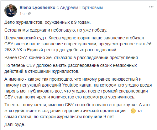 "Как же так произошло, что никому ранее неизвестный и никому ненужный донецкий Youtube канал, на котором кто угодно введя пароль мог публиковать все, что угодно, после громкой спецоперации СБУ стал популярен и количество его просмотров увеличилось. То есть, получается, именно СБУ способствовало его раскрутке. А это же "содействие" в создании террористической организации, та самая статья, по которой журналисты получили 9 лет", - объясняет свою позицию адвокат.