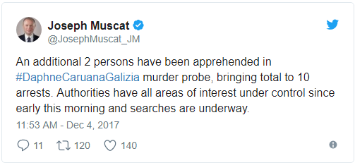 "Еще двух человек задержали по делу об убийстве Дафны Каруани Галиции. Таким образом, количество арестованных возросло до 10. Обыски продолжаются с самого утра", – написал он.