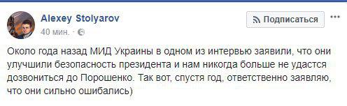 "Около года назад МИД Украины в одном из интервью заявило, что они улучшили безопасность президента и нам никогда больше не удастся дозвониться до Порошенко. Так вот, спустя год, ответственно заявляю, что они сильно ошибались", - написал пранкер.