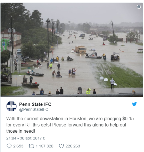 Третье место в рейтинге занял Пенсильванский университет, который пообещал перечислять по 15 центов с каждого ретвита на счета пострадавших от урагана "Харви" на юге США. Пост собрал 1,2 миллиона ретвитов, жертвы стихии получили около 180 тысяч долларов.