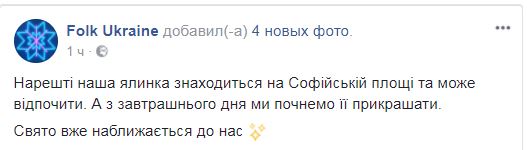 В четверг, 7 декабря на Софийской площади будут наряжать главную елку страны. Об этом сообщают организаторы новогоднего праздника Folk Ukraine на странице в Facebook.