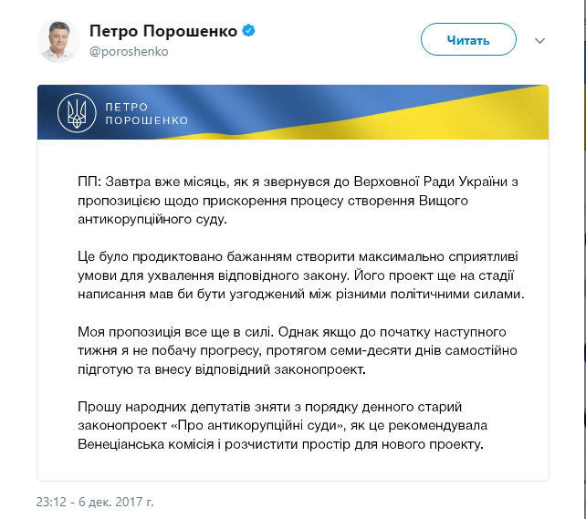 Напомним, что в средине ноября люди Порошенко в Раде блокировали внесение нового законопроекта об антикоррупционном суде.