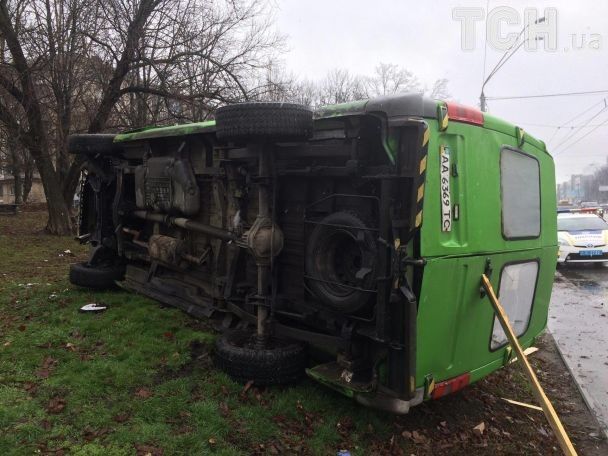 Микроавтобус с надписью "телевидение" столкнулся с автомобилем, после чего его вынесло на тротуар, где он перевернулся на бок.