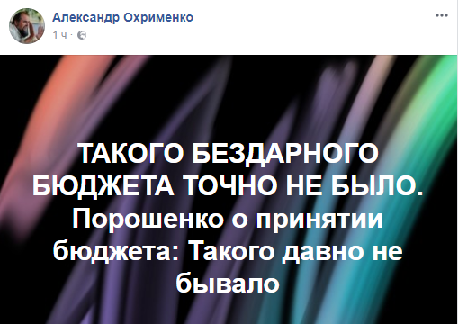 Президент Украинского аналитического центра Александр Охрименко считает, что такого бездарного бюджета еще не было. Так он переиначил слова Порошенко о принятии бюджета: "Такого давно не бывало".