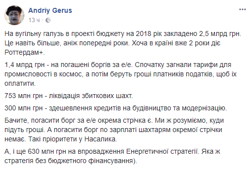 "На угольную отрасль в проекте бюджета на 2018 год заложено 2,5 млрд грн. Это даже больше, чем предыдущие годы. Хотя в стране уже 2 года действует Роттердам +.