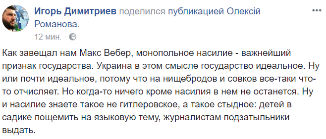 "Как завещал нам Макс Вебер, монопольное насилие - важнейший признак государства. Украина в этом смысле государство идеальное. Ну или почти идеальное, потому что на нищебродов и совков все-таки что-то отчисляет. Но когда-то ничего кроме насилия в нем не останется. Ну и насилие знаете такое не гитлеровское, а такое стыдное: детей в садике пощемить на языковую тему, журналистам подзатыльники выдать", - объясняет "силовой" перекос блогер Игорь Дмитриев.