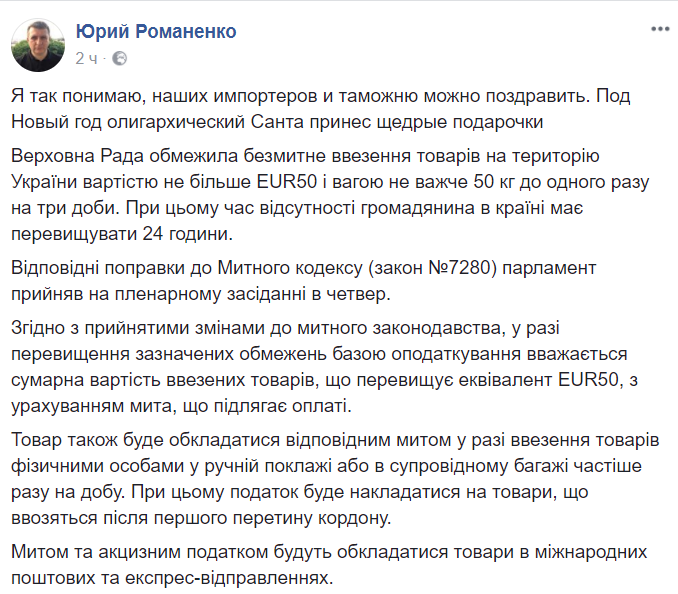 "Я так понимаю, наших импортеров и таможню можно поздравить. Под Новый год олигархический Санта принес щедрые подарочки", - комментирует новацию журналист Юрий Романенко.