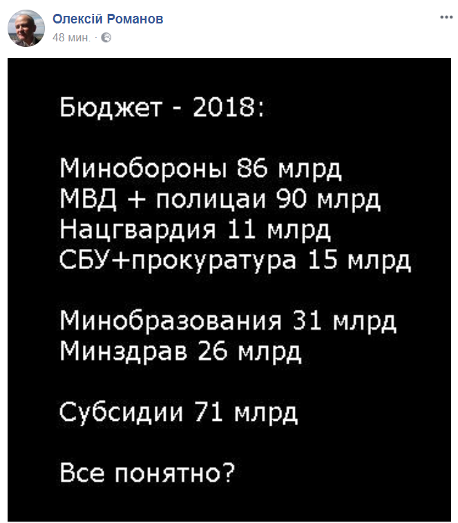 Другие комментаторы обращают внимание на перекос в сторону силового блока - причем армия оказалась далеко не самым большим реципиентом. Так, на МВД и полицию власти потратят 90 миллиардов гривен (для сравнения на образование - всего 31 млрд, а на медицину - 26).