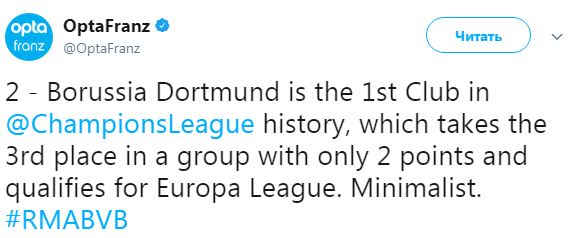 Дортмундская "Боруссия", где играет наш Андрей Ярмоленко, стала первым клубом в истории Лиги чемпионов, которая по итогам группового турнира вышла в Лигу Европы всего с двумя очками в своем активе.