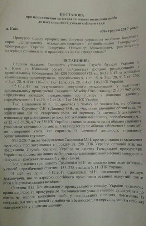 В постановлении отмечается, что 8 декабря Департамент уголовного розыска Нацполиции получил сведения о том, что Саакашвили может скрываться в квартире на проспекте Отрадном. Обосновывая необходимость проведения обыска в постановлении отмечается, что проведение других следственных действий является невозможным из-за риска "уничтожения, изменения или искажения предметов, документов и электронных носителей информации", которые являются доказательствами по делу, а также "дальнейшего сокрытия подозреваемого Саакашвили от органов досудебного расследования", - говорится в сообщении.
