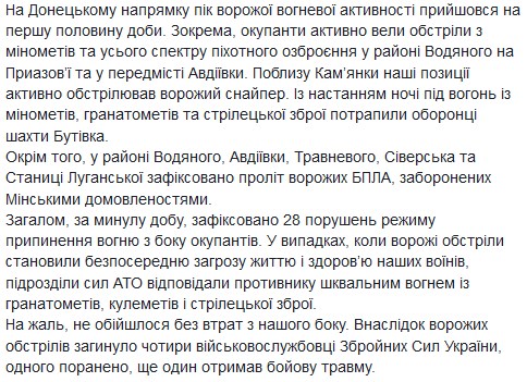 Отмечается, что на луганском направлении эпицентром нестабильности остается Светлодарская дуга, где враг несколько раз из минометов различных калибров и всего спектра пехотного вооружения и БМП вел огонь вблизи Луганского и Майского; возле Майского боевики выпустили более полусотни мин калибра 120 мм.